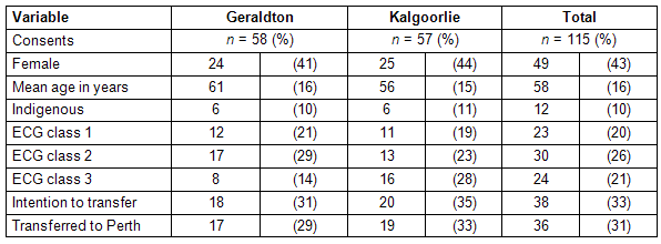 Over 50 consents were obtained at each site. Of the 115 enrolled patients (mean age of 58 years), 36 (31%) were transferred to Perth. Table 2 lists further characteristics.