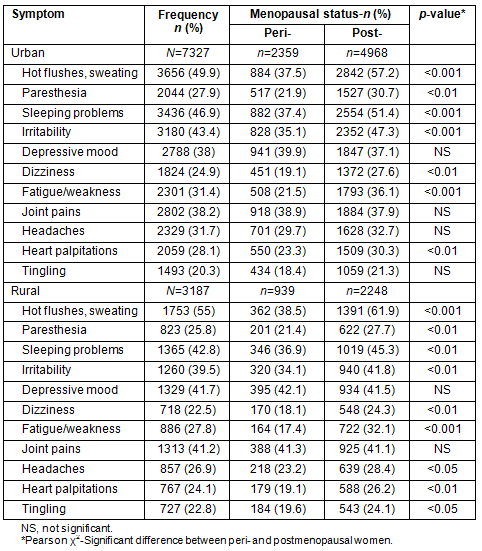 Table 3: Frequency of menopausal symptoms in rural and urban women according to menopause status