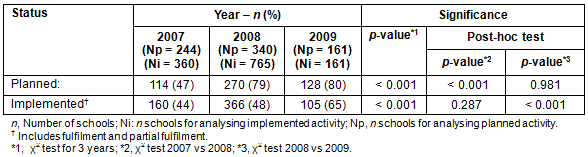 The proportion of schools that planned health-related activities increased after distribution of the 10QC and was stable 1 year after distribution (2007 vs 2008, p <0.001; 2008 vs 2009, p=0.981). The percentages were 47%, 79% and 80% in the years 2007, 2008 and 2009, respectively (Table 1). In terms of implementation, 44%, 48% and 65% of schools implemented at least one health-related activity in the years 2007, 2008 and 2009, respectively. The proportion in 2009 was higher than in the other 2 years (p <0.001).