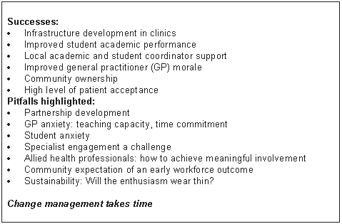 From the initial evaluation of the 2002 GGT PRCC program it is clear that some aspects worked well (Fig 4). In particular, the positive student feedback and examination performance in the initial year of the program was very important for all involved. There were some significant pitfalls, which are important to highlight for any region considering the development of a similar program. Partnership development took time. General Practitioners showed significant anxiety initially in regards to their teaching capacity, time commitment of students, and the infrastructure demands on their practices. Specialists' engagement was a challenge initially, requiring a significant change to their teaching paradigms. Horizontal and vertical integration of teaching was complex and required ongoing effort to maximize efficiency. The community had high expectations of the workforce outcome and these needed to be tempered with realistic expectations of the length of time required to train doctors, and the understanding of workforce mobility.