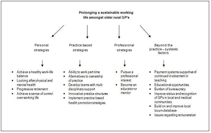 From the results of this qualitative study, it is evident that the strategies discussed by GPs as facilitating and enabling them to work happily and productively up until and beyond traditional retirement age extend across personal and practice factors, local and regional issues, as well as government and legislative aspects.