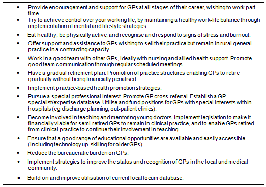 Some GPs expressed their concern that they themselves or colleagues they knew of were feeling 'forced' to retire fully from the workforce despite still finding enjoyment in their clinical work, due to not having a financially viable option for reducing their work days. One GP suggested that the local GP representative body (Medicare Local) would be ideally placed to facilitate and promote solutions to this at the local level.