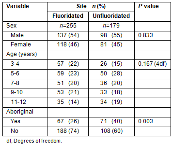 A dental examination was performed for 434 children (response rate 72%). Of the unexamined children, six had informed parental consent but refused an examination, 13 were absent from school, and the remainder did not obtain informed parental consent. Participants ranged in age from 3 to 12 years (mean age 7.7 years) and more participants were male than female (235 & 199, respectively). More participants identified as non-Aboriginal (68%) than Aboriginal (32%) and slightly more attended school in fluoridated sites (59%) than unfluoridated sites (41%). Most children used fluoridated toothpaste (99%), and most had never taken fluoride tablets (95%). Exactly half of all parents reported having a healthcare or concession card and more than two-thirds of parents (73%) had completed school. Finally, only half of all children (49%) brushed their teeth more than once a day, and just over half (56%) had visited the dentist in the previous 12 months. Table 1 shows the number and proportion of children at fluoridated and unfluoridated sites by sex, age and Aboriginal status.