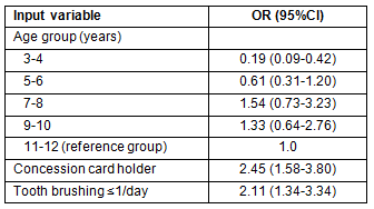 In the final model, the only factors significantly associated with having caries (Y/N) were age group, concession card status and tooth-brushing frequency. Children of parents with a concession card were approximately 2.5 times more likely to experience caries, and children who brushed their teeth less than twice/day were approximately twice as likely to experience caries. Gender, water fluoridation, Aboriginal status and parental education were not significant predictors of caries experience (Table 2).