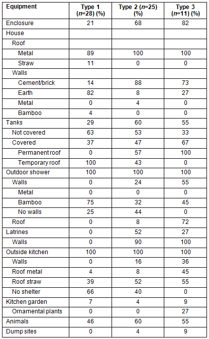 The different level of equipment led to three major habitat types being distinguished in the study area. Two extreme types could clearly be distinguished: type 1, very precarious with modest construction materials; and type 3, with hard construction materials, enclosed spaces, and covered water points. An intermediate type (type 2) was also apparent, which possessed a combination of several types of modest materials such as straw or hard (such as brick), with open spaces and uncovered water points.