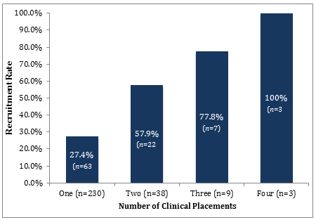 To examine whether the improved recruitment rate with increasing number of clinical placements was confounded by rural/remote upbringing (ie individuals originally from a rural/remote area may have been more likely to complete more than one clinical placement), additional analyses were completed to control for location of upbringing. These results indicated that: