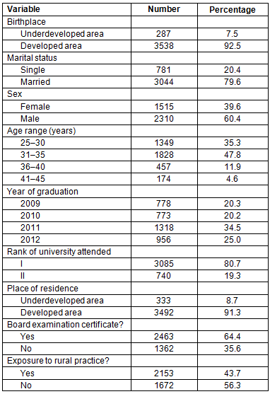 Physicians' personal data were collected from the MOHME directorate general for personnel. Physicians' personal information included age, sex, specialty, birthplace, the rank of the university attended, place of residence, previous exposure to rural practice, board examination certification, and year of graduation. Further, to categorize the graduates' birthplace and place of residence into two zones (developed and underdeveloped areas), the socioeconomic development index of provinces and regions established by the government was used. The universities where the study participants graduated were categorized as I, II or II - according to the system used by MOHME. Classification of the medical universities has been made on the basis of different criteria (ie number of beds of affiliated hospitals, financial and scientific capacity, number of faculty members, research activities, and efficiency of use of research capacities). Medical schools categorized as type III are not allowed to hold residency and fellowship programs.