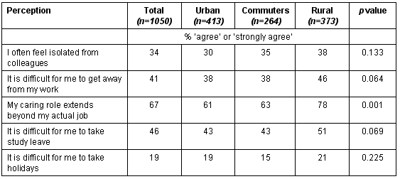 Respondents were asked to indicate the extent to which they agreed with five statements relating to professional isolation and work pressure (Table 4). Isolation, an extended caring role and a perceived inability to get away from work for holidays and study leave were surprisingly common in urban as well as rural workers. For each of five statements, those who both lived and worked in rural areas perceived greater difficulty than those in other location types. When we compared the perceived isolation of the different professional groups, we found that although the doctors were most likely to perceive that their caring role extended beyond their work (p = 0.00), professional allied to medicine were most likely to feel professionally isolated and to encounter difficulties getting away for study leave.