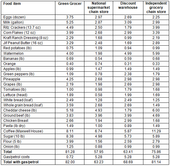 Many residents in urban and rural areas drive distances further than the nearest grocery store to purchase foods at the best price2,3,18-21. The most common barrier to obtaining food in rural areas is cost18,21. The food price comparison in this study supports this behavior, showing people made significant savings by traveling greater than 17.7 km (11 miles) to purchase common food items. If the Official USDA Food Plans are used to estimate food costs22 and the calculated 30% increase in common food costs between the Green Grocer and the national supermarket chain store for this study were assumed to be consistent storewide, a family of four could save US$44.82 per week or US$179.28 per month by traveling the further distance to buy food at the large supermarket22.