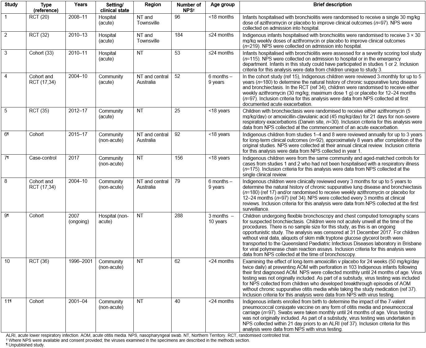 Data were sourced from 11 prospective studies (Table 1). Eight involved children with either acute or chronic respiratory illnesses17,20,32-35, one involved children who acted as case-controls in study 4 and the remaining two focused on otitis media36. These were conducted in the NT, central Australia, and in the northern Queensland city of Townsville between 1996 and 2017 inclusive. One of the studies is ongoing, and the main results (reporting of primary aims) of seven studies and a substudy have been published already17,20,32-37.