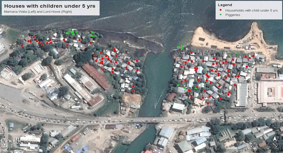 Figure 1: Map of Mamana Wata (left) and Lord Howe settlement (right) showing the surveyed under-five households.