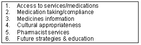 Pharmacist services and cultural appropriateness: Participants were asked to respond to questions regarding the cultural appropriateness of pharmacy services, counselling provided by pharmacists, perceptions of pharmacy services and pharmacists, and access to these services. The consensus of most participants of 'culturally appropriate' was that it was about treating the person as an individual, with respect, and with an understanding of their culture and the concerns they may have. It was 'what is appropriate to make that person feel more comfortable' [R3]. The majority believed it was not about 'flags and banners' [R1]. One respondent believed that focussing on being politically correct about cultural appropriateness led to missing the point of what your service is actually providing.