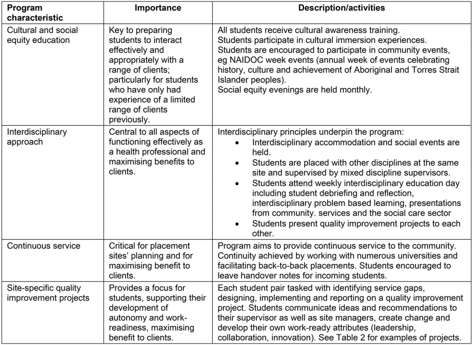 Table 1: Defining characteristics of the University Centre for Rural Health’s work-ready placement program, Northern Rivers region, New South Wales