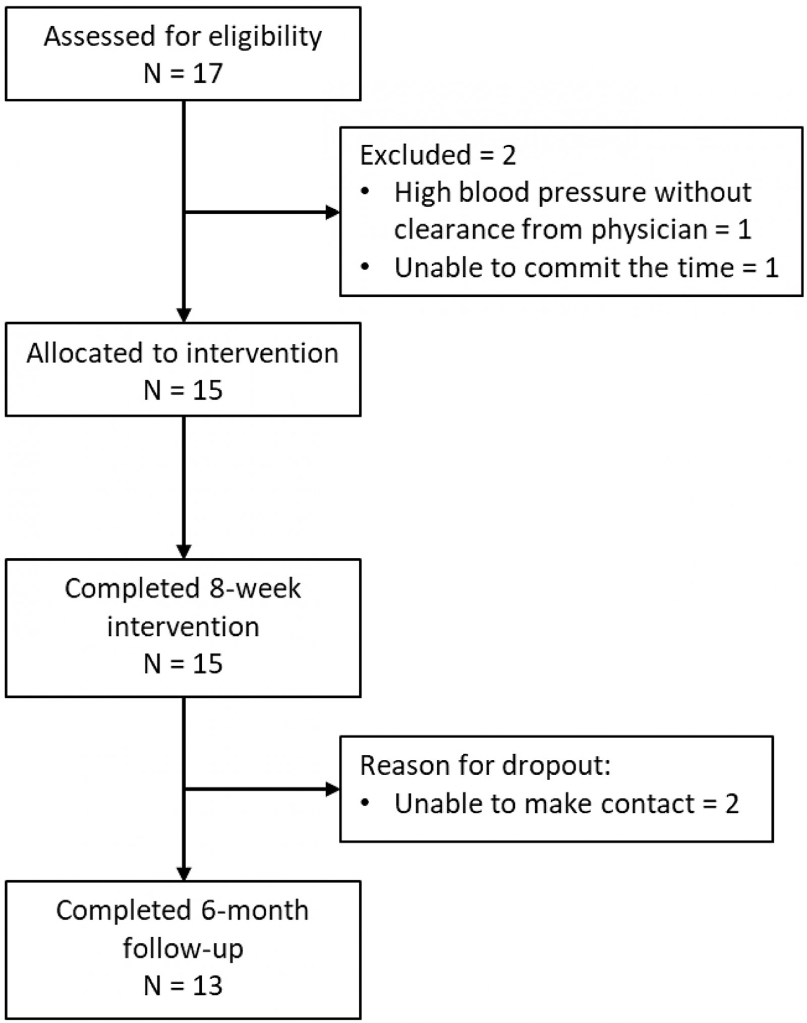 For feasibility, there were no dropouts over the 8-week intervention. However, at the 6-month follow-up, the research team was unable to contact 2 of the 15 participants. All 15 participants of the 8-week intervention completed more than 80% of their scheduled treatment sessions (Table 3). At the 6-month follow-up, all 13 participants were satisfied with the intervention and deemed the study as useful or helpful to them.