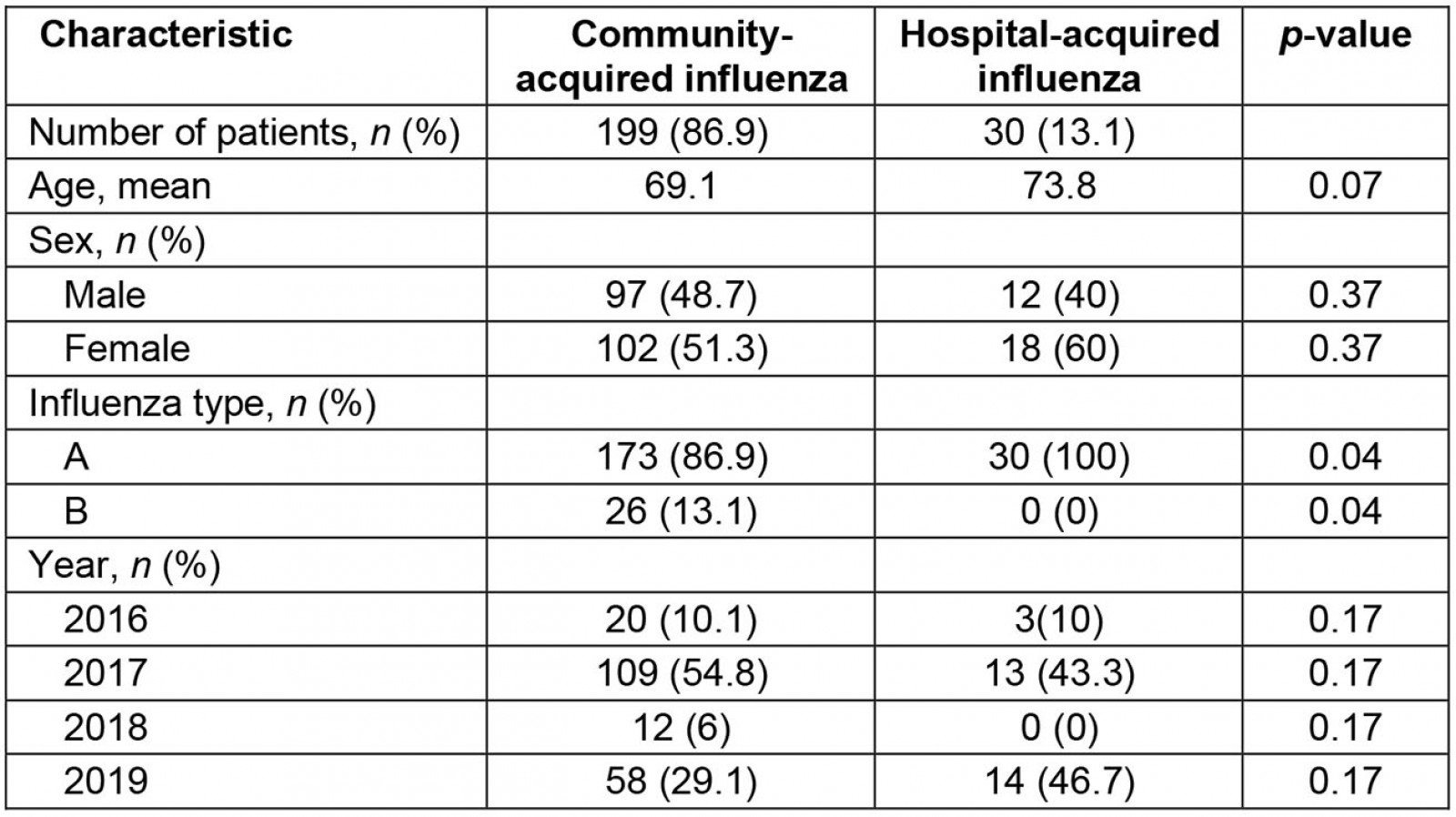 A total of 229 patients had a diagnosis of either type A or type B influenza during the study period. Of those, 86.9% of patients had community-acquired influenza and 13.1% were nosocomial cases.
