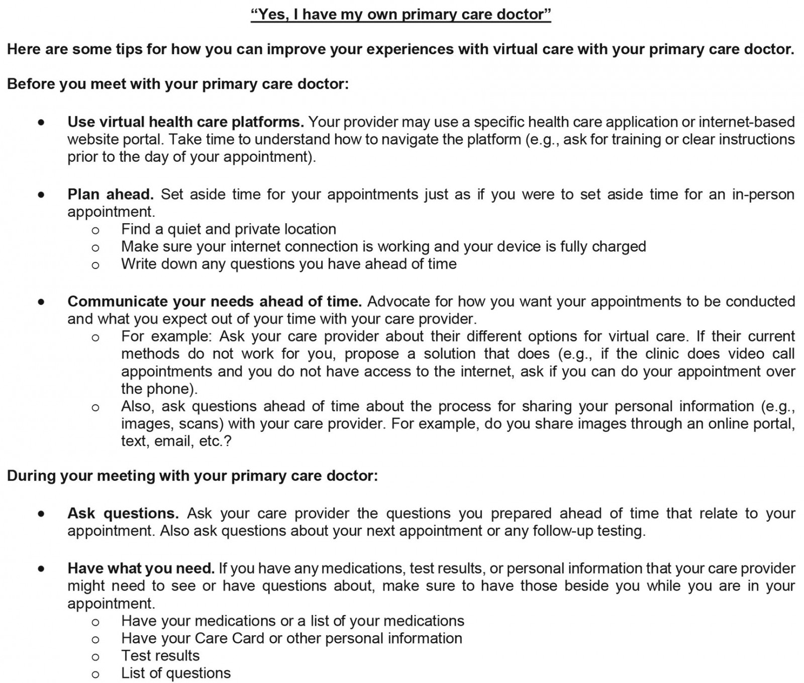 Drawing from the stakeholders’ unique knowledge and perspectives, all partners highlighted the importance of developing two preparatory VH tip sheets to support patients and healthcare providers for optimal VH appointments. Using the synthesis of the stakeholder discussions and consultation of the literature, the initial versions of the tip sheets were developed by the authors, and sent to the entire partnership to review and refine. Both sheets use accessible language to outline a temporal set of actions that residents (Appendix II) and healthcare providers (Appendix III) can follow to enhance VH appointments. The content of the tip sheets represent a synthesis of stakeholder suggestions and literature-identified promising practices.