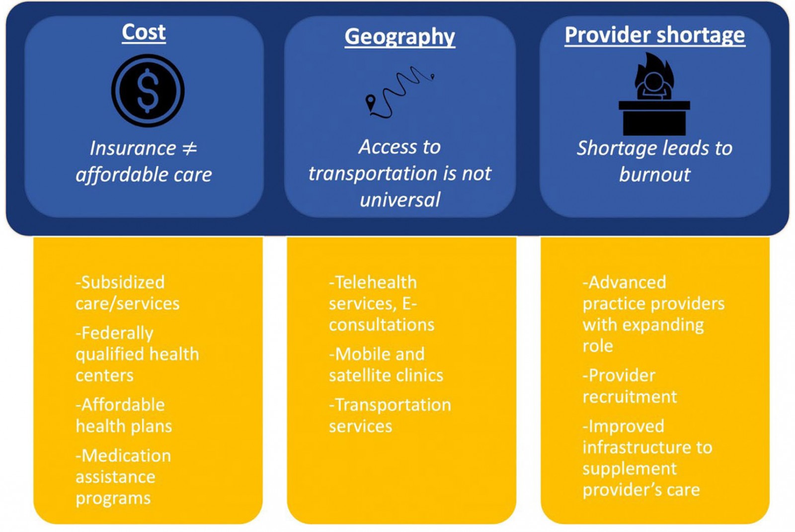2. Mobile and satellite clinics: Participants discussed mechanisms to circumvent transportation issues by bringing health care directly to the patients. For instance, some discussed investment in mobile health clinics to overcome transportation barriers.