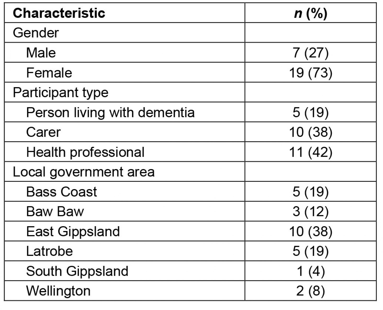 The study was advertised on the Gippsland PHN website, local Facebook pages, emailed news bulletins, local newspaper advertisements and patient referrals from healthcare professionals. Recruitment was supported by two local community health services. Participants were invited to contact a member of the research team, who provided them with information about the study, its purpose, what was involved in taking part and, if they were agreeable to participating, obtained their written consent. When written consent was not possible, verbal consent was recorded upon commencement of the interview. Participants living with dementia were deemed as having capacity to participate when first providing consent and again on commencement of the interview to ensure that they understood what was involved and that they were still happy to participate.