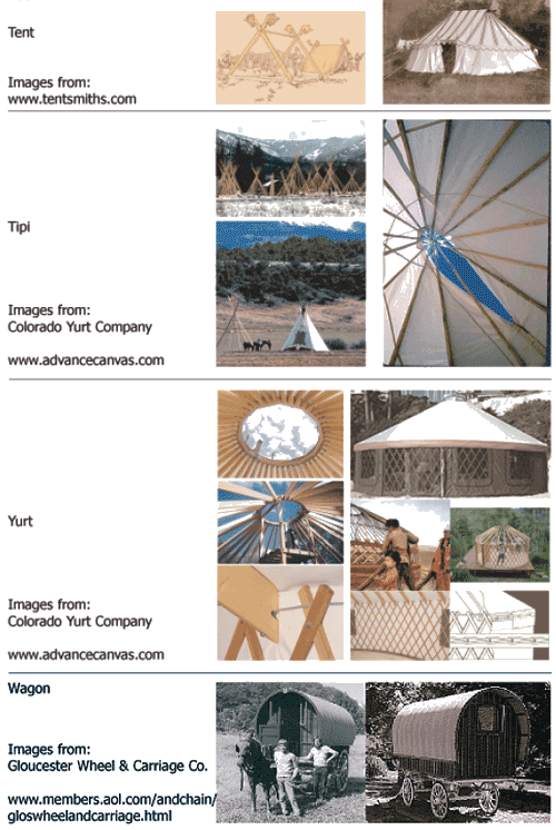 Category: Category describes the current shelter's ancestry in terms of the four predecessors of portable architecture: tipi, tent, yurt and wagon. This will allow for easier comprehension and comparison of the structural basis of each shelter.