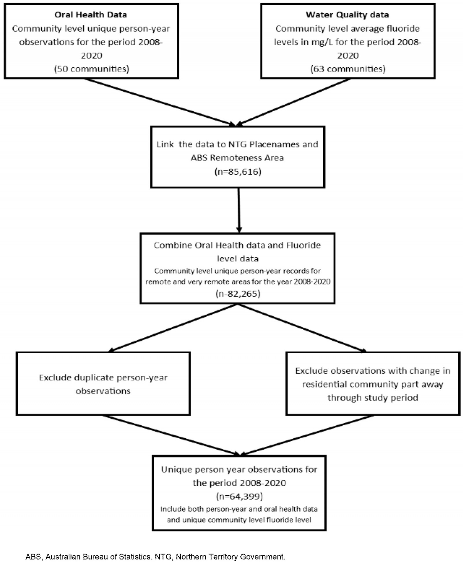 The sampling strategy is outlined in Figure 1. For a total of 91 sites across the NT, consisting of 19 urban centres, and 72 remote and very remote Aboriginal communities, data for drinking water quality data collections for 2008–2020 were held by the Power and Water Corporation. Drinking water quality data from 75 localities were matched to the 50 remote community populations included in the study14. Data were cleansed of duplicate entries. Communities with fewer than 100 total observations were excluded to improve data quality and prevent inadvertent identification of individuals. To minimise confounding of results, individuals’ demographic information was screened for a change in location partway through the study period, and these records were removed from the dataset. The oral health data sample captured all children aged 1–17 years who had received dental care in remote and very remote locations of the NT from 2008 to 2020. For each unique patient record, dental caries severity was measured and reported using the decayed, missing and filled teeth index (dmft (primary teeth)/DMFT (permanent teeth)), which is a standard epidemiological measure of dental caries experience15. A dmft/DMFT score was collected per individual, per year (termed ‘person-year observation’) for all children in the sample.