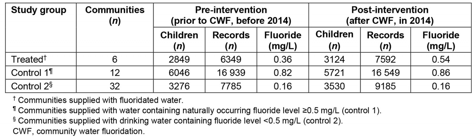 Table 1: Number of communities, children, observations and fluoride levels for treatment and control groups, by pre- and post-intervention periods
