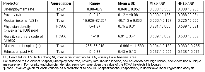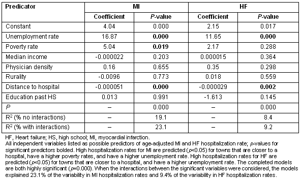 In univariable linear regression analysis the following variables were significant (p < 0.05) predictors of higher MI hospitalization rate: higher poverty rate, lower median family income, higher unemployment rate, less distance from place of residence to the closest hospital, and lower educational attainment. The only significant univariable predictor of higher HF hospitalization rates was higher unemployment rate. There are trends toward high poverty rate and distance from place of residence to the closest hospital as univariable predictors of high HF hospitalization rates (Table 1).